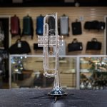 This used 2024 Bach 170S43GYR Bb trumpet is in excellent condition. We cleaned it and precision-aligned the valves, and the compression is virtually like new. It does have a few light scufffs here and there, as well as a very tiny dot of plating failure inside the bell flare, but the silver looks new otherwise. It's part of the Apollo line, so there are some design differences from the classic Stradivarius, including a two-piece 43GY bell with a gold brass stem and yellow brass flare. The reverse 6R leadpipe is fairly free-blowing, and the horn has a vibrant, clear sound with some warmth to it. Valve action is excellent, and response is very quick. Comes with the original case in like-new condition.